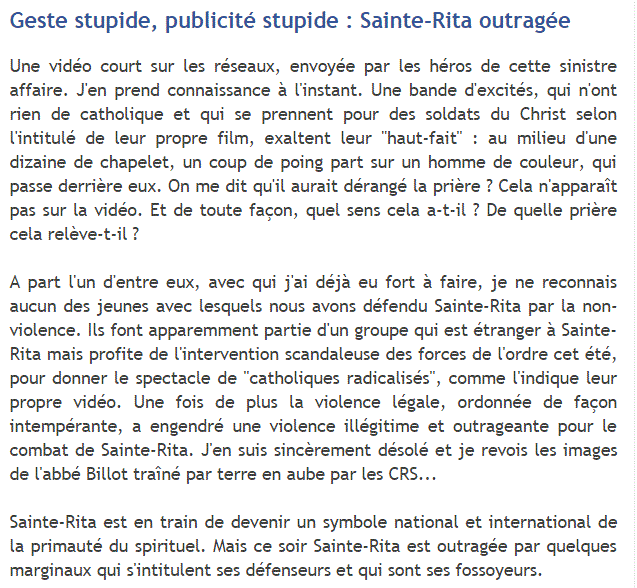 A part l'un d'entre eux, avec qui j'ai déjà eu fort à faire, je ne reconnais aucun des jeunes avec lesquels nous avons défendu Sainte-Rita par la non-violence. Ils font apparemment partie d'un groupe qui est étranger à Sainte-Rita mais profite de l'intervention scandaleuse des forces de l'ordre cet été, pour donner le spectacle de "catholiques radicalisés", comme l'indique leur propre vidéo. Une fois de plus la violence légale, ordonnée de façon intempérante, a engendré une violence illégitime et outrageante pour le combat de Sainte-Rita. J'en suis sincèrement désolé et je revois les images de l'abbé Billot traîné par terre en aube par les CRS...