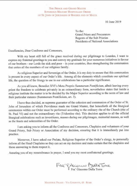 Texte de la lettre circulaire de Fra’ Giacommo Dalla Torre (traduction Riposte Catholique)